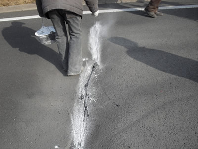 剛灌完的密封膠在其表面撒上干燥細沙,等密封膠充分冷卻,清掃完路面碎渣后,才能開放交通,一般冶卻時間為15分鐘左右,具體時間根據當時氣溫靈活掌握。